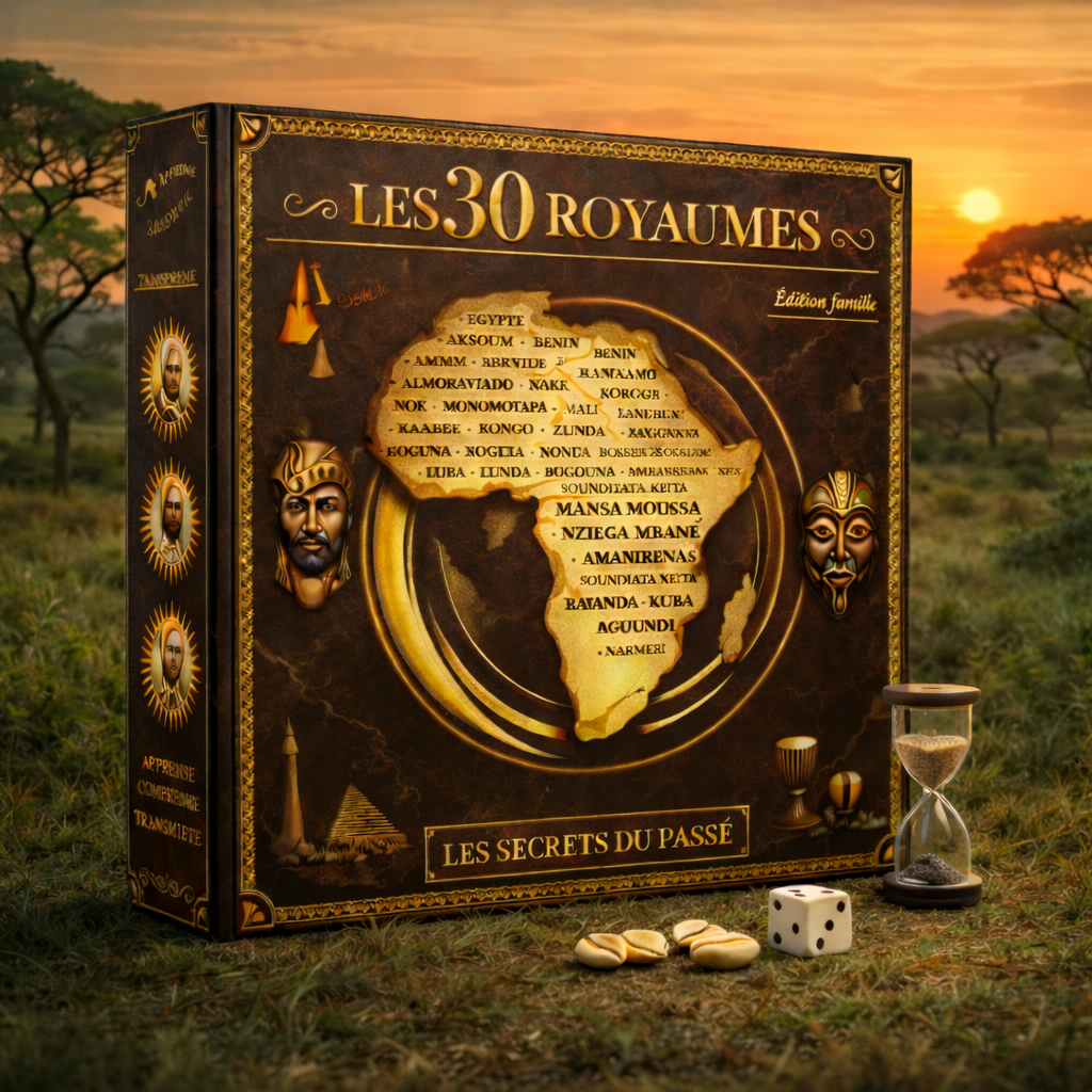 Découvre Les 30 Royaumes – Les Secrets du Passé, un jeu de culture générale qui te fait voyager à travers les royaumes africains, leurs artefacts et personnalités légendaires. En famille ou entre amis, apprends, débat, rigole et gagne des points de sagesse tout en explorant une histoire trop souvent méconnue.